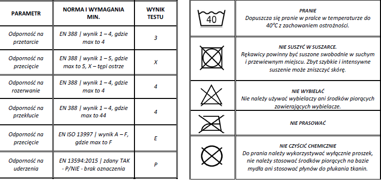 Rękawice te nie zapewniają ochrony przed czynnikami cieplnymi, chemicznymi, zagrożeniami bakteriologicznymi, prądem elektrycznym oraz ruchomymi i obrotowymi ostrzami. Uszkodzone rękawice nie zapewniają odpowiedniego poziomu ochrony i należy je natychmiast wymienić na nowe i wolne od wad.